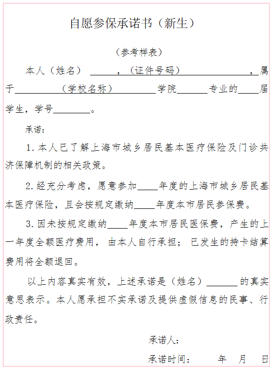 对于无法登录“随申办市民云”APP的新生,在参保确认时限的工作日(上午8:30-11:00,下午13:30-16:30)内,带好校园一卡通和身份证件,至校医院515室填写《自愿参保承诺书(代承诺)》【见附件四】,并签字确认,由相关负责老师通过“一网通办”网站的相应事项,集中办理代为参保确认。办理前可电话联系校医院医保办预约。