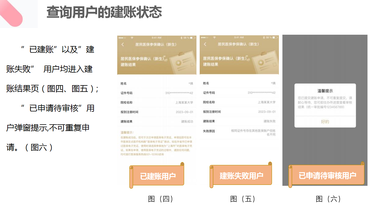 建账失败的新生,将失败原因本科生反馈给各班的兼辅、研究生反馈给负责的郑老师,负责老师会在相关工作群中与校医院联系,校医院反馈至区医保沟通处理。建账状态查询页面【见附件三】。