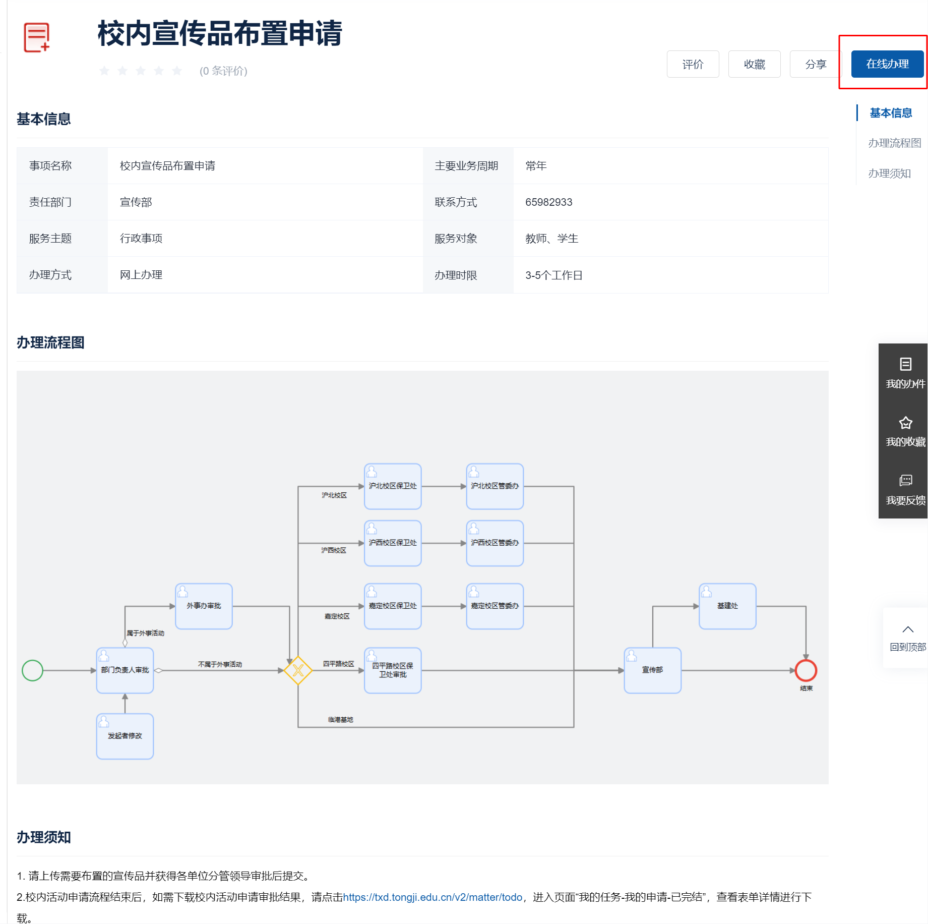 如仅为宣传品布置不涉及活动申请,可直接在一网通中搜索“校内宣传品布置申请”,点击“在线办理”。请按照实际摆放位置进行申请,并上传宣传品最终版进行审核。如需要使用四平路校区和平路、南大道固定展位,请按要求进行展位预约。