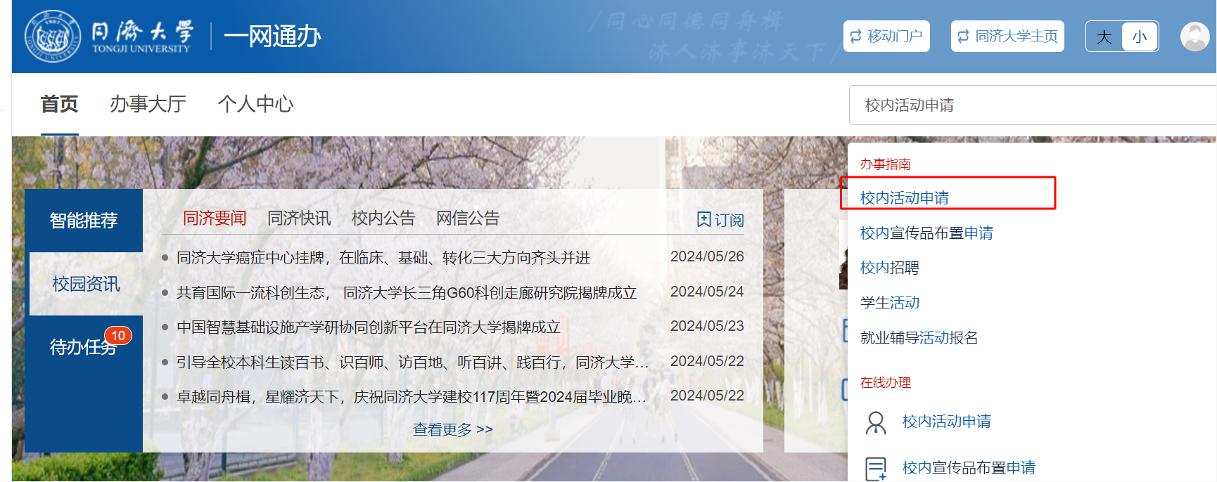 9月15日起,预约系统将完全在一网通办上使用。校内活动申请和宣传品布置申请需在一网通办平台线提交申请(https://all.tongji.edu.cn)。原则上不再接受纸质单、OA预约。