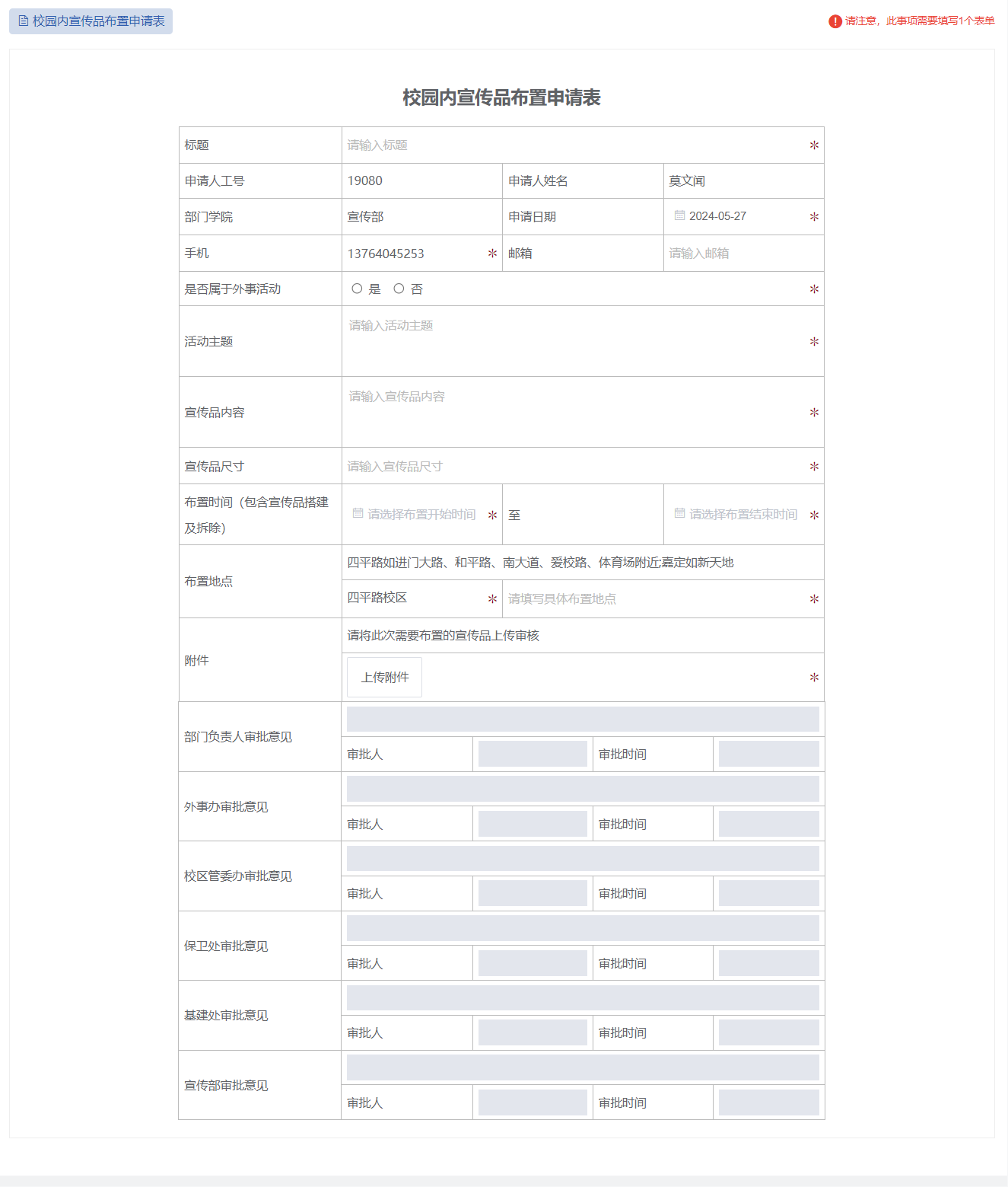 按要求填写相关内容,并上传活动相关申请材料。如需要申请海报等宣传品布置,请按照实际摆放位置进行申请,并上传宣传品最终版进行审核。如需要使用四平路校区和平路、南大道固定展示栏的展位,请按要求进行展位预约。