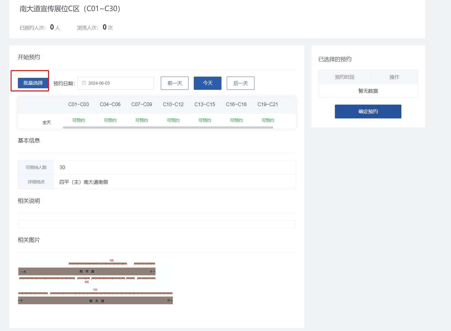 根据编号示意图,选择想要申请的展板位置,点击开始预约进行申请。