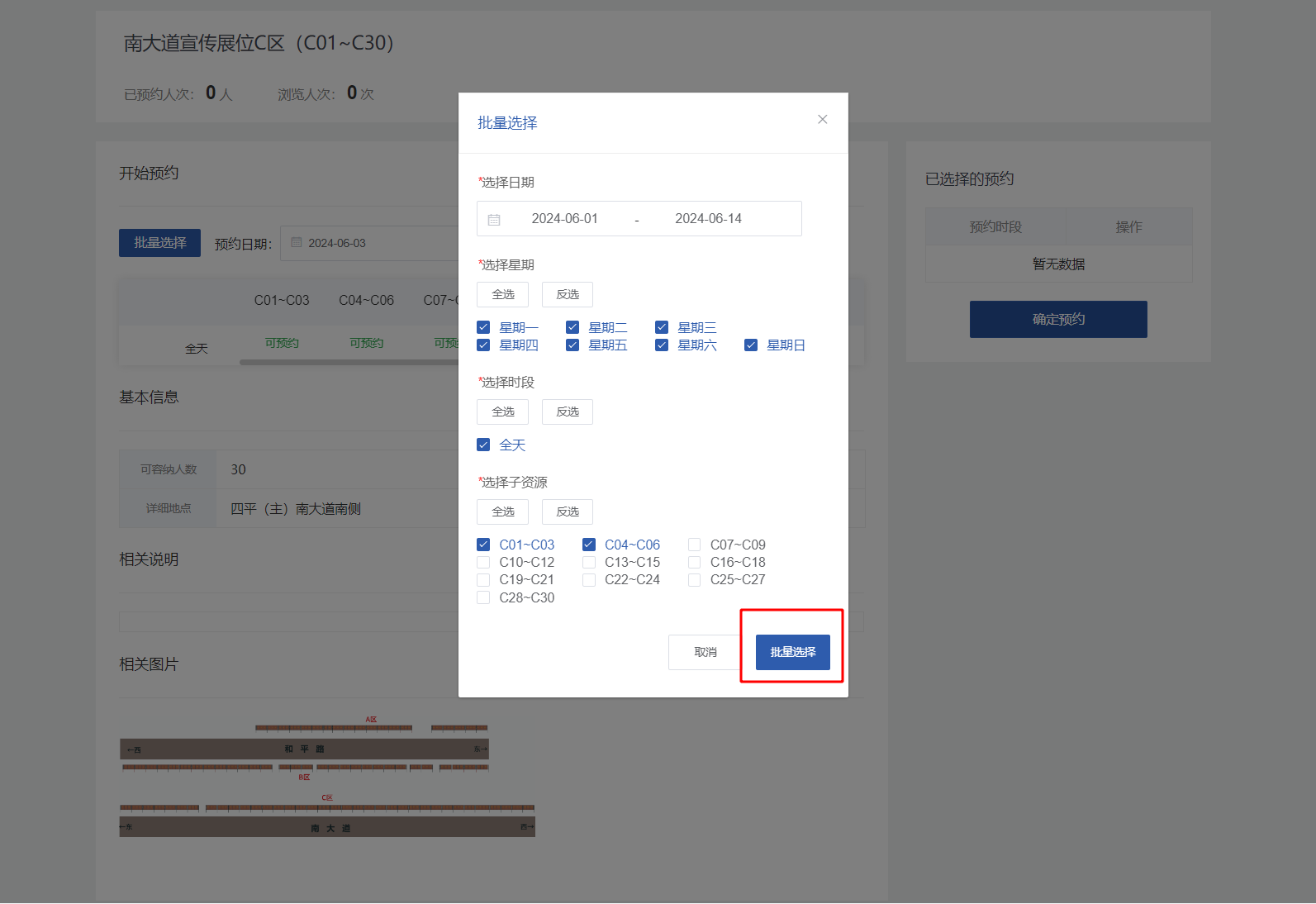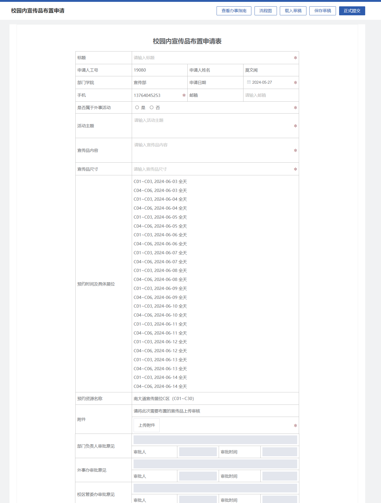 每块展位大小为A0尺寸,以预约6月1日至14日的C01-C06,6块展位为例,可在选定模块后进行批量预约。可在批量选择中选定块数及使用时间,确认后预约后进入表单填写,预约时间及摊位会自动同步到表单中,按要求填写其他内容并确认无误后可提交审批。具体预约审核结果以流转至宣传部审批后为准。由于展位数量有限,建议合理化安排申请,如不使用请及时取消申请释放资源。