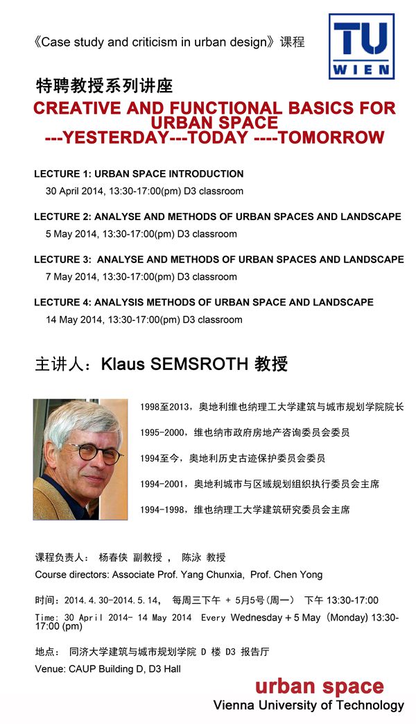 【4月30日~5月14日 特聘教授系列讲座】- Creative and Functional Basics for Urban Space by Prof. Klaus Semsroth from TU Vienna