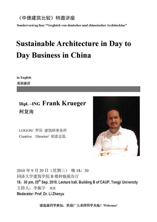 【9月29日 研究生《中德建筑比较》特邀讲座】- “Sustainable Architecture in Day to Day Business in China”