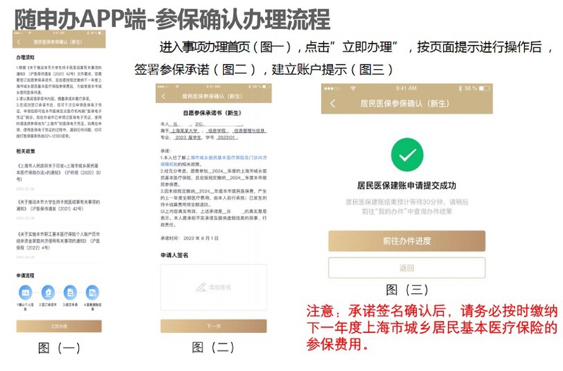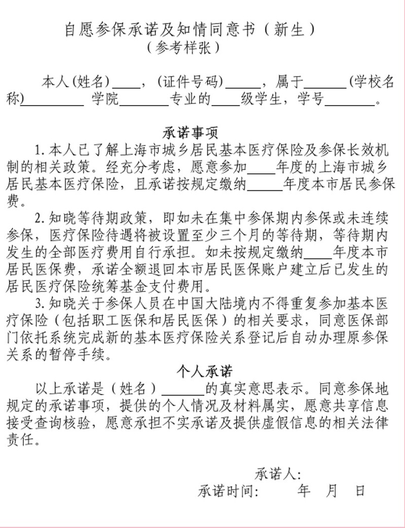 即日起-9月19日24:00新生可通过“随申办市民云”APP或支付宝、微信随申办小程序中的“居民医保参保确认(新生)”事项,签署《自愿参保承诺及知情同意书(新生)》【见附件一】。确认参保意愿,承诺能按规定足额缴纳下一年度(2026年度)居民医保费;知晓参保人员在中国大陆境内不得重复参加基本医疗保险的相关要求,同意医保部门依托系统完成新的基本医疗保险登记后自动办理原参保关系暂停手续。参保人需对承诺的真实性和承诺事项内容负责,并承担相应的民事或行政责任。