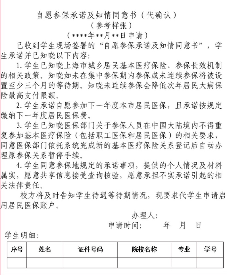 对于无法登录“随申办”的新生,在参保确认时限的工作日(上午8:30-11:00,下午13:30-16:30)内,带好校园一卡通和身份证件,至校医院513室(高校参保经办服务点)填写《自愿参保承诺及知情同意书(代承诺)》【见附件三】,并签字确认,由相关负责老师通过“一网通办”网站的相应事项,集中办理代为参保确认。办理前可电话联系校医院医保办预约。
