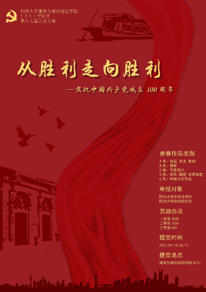 2021年是中国共产党成立100周年。1921年8月3日黄昏,浙江嘉兴南湖的暑热逐渐散去。湖面上一艘中等大小的画舫内,气氛庄重肃穆。在“中国共产党万岁”的低声呼喊中,中国共产党第一次全国代表大会闭幕。中国共产党自1921年7月23日创建以来,经历了内忧外患的重重考验,逐步发展成为世界第一大党,带领中华民族走上复兴之路。为庆祝中国共产党成立100周年,同时全面贯彻落实习近平新时代中国特色社会主义思想,第十七届“公司奖”艺术大赛将以“从胜利走向胜利——庆祝中国共产党成立100周年”为主题全面展开。