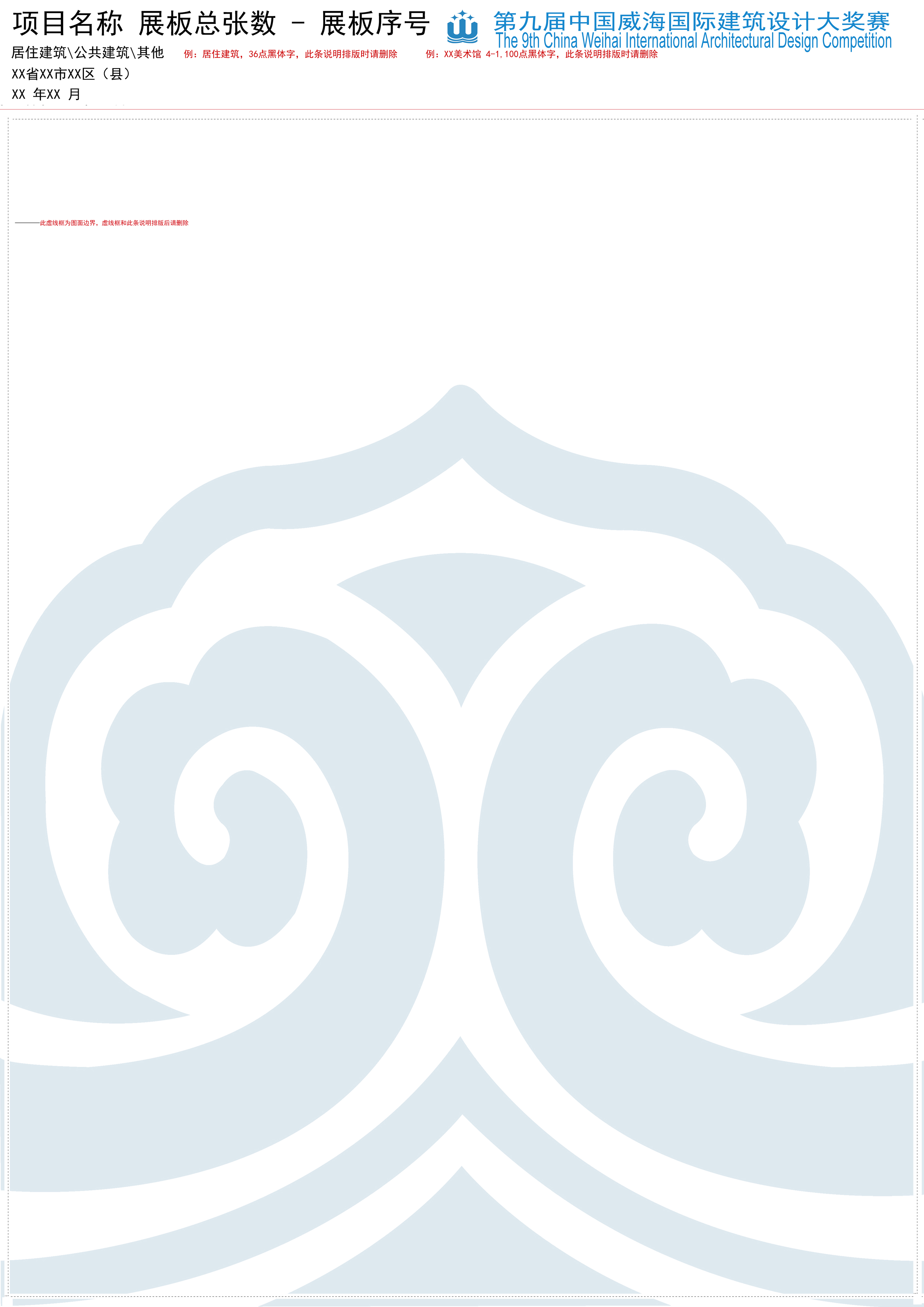 1. 图板尺寸为A0图板(请在中国建筑学会网站www.chinaasc.org下载)。请参赛者提供2块电子版A0图板设计方案,以项目名称作为文件名,并按顺序编号。参赛作品图板,由主办单位负责统一制作。