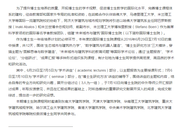2016年度“未来城市与建筑”国际博士生院课程通知