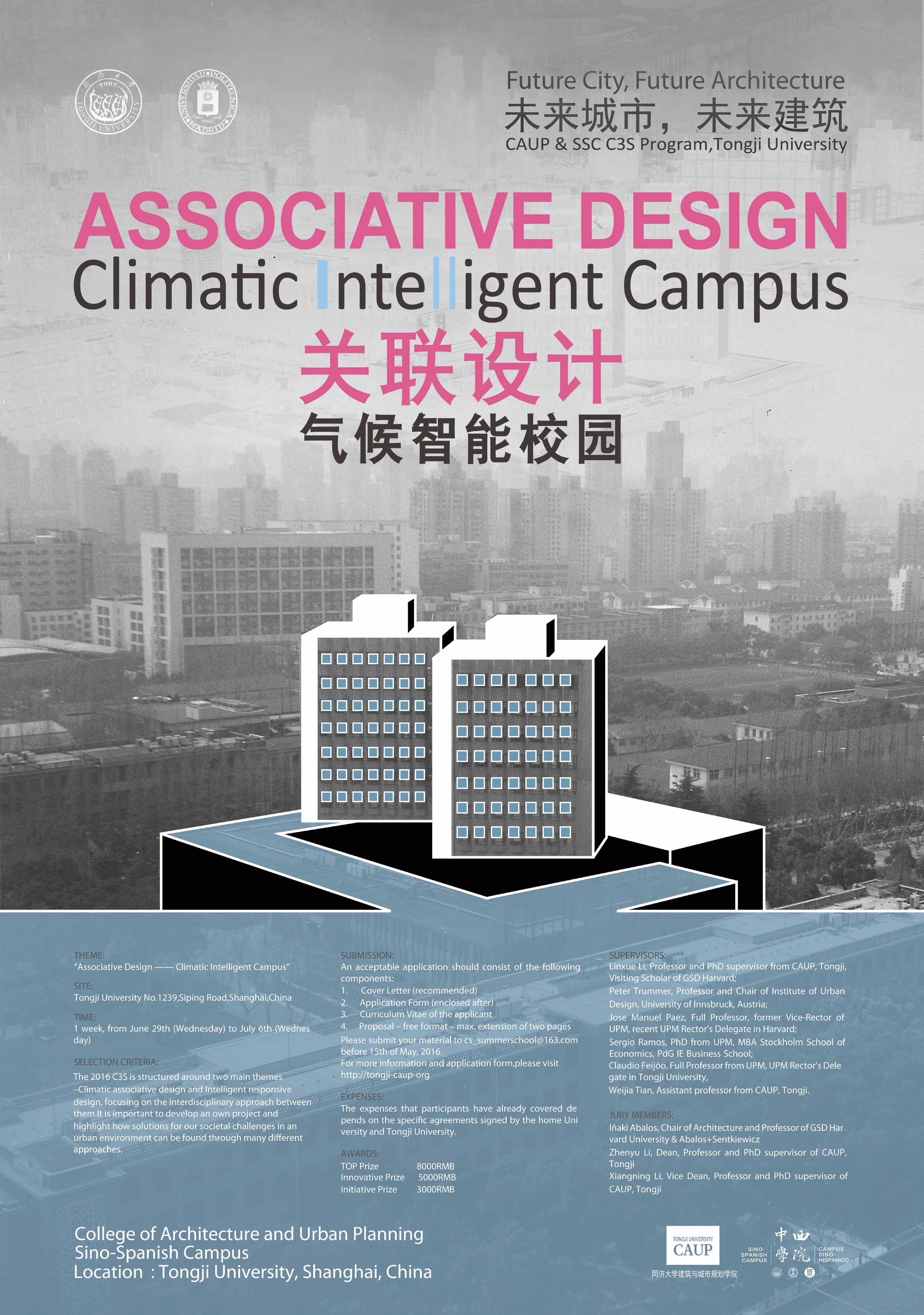 The 2016 C3S will offer students the opportunity to apply their acquired knowledge in an intensive workshop where a realistic practical project will be thoroughly developed, following the rationale of an entrepreneurial Experiment Lab under the title “Associative Design —— Climatic Intelligent Campus”. It will also be the chance to join international students from UPM, the 8 top Chinese Universities in Architecture, Tongji, Harvard and Rice University in a multicultural multidisciplinary setting, as well as meeting international recognized experts which will help to assess students’ projects and in general will contribute to the exchange of ideas and knowledge. The limited number of participating students (20) will grant an intense learning atmosphere and the full immersion into a process of realistic innovation development.