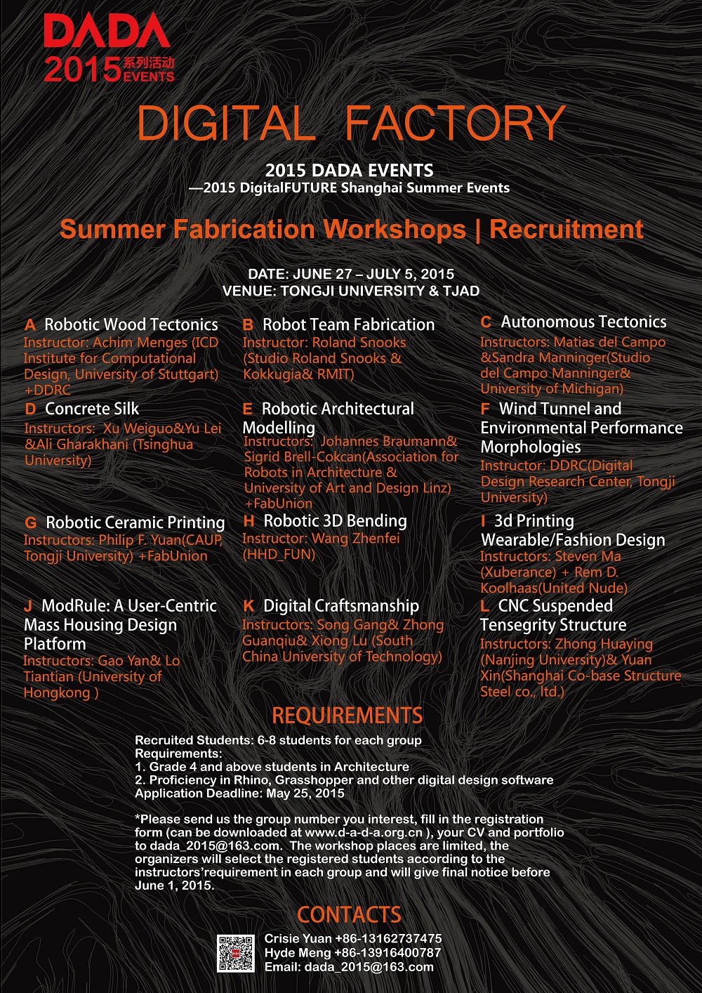 * Please send us thegroup number you interest, fill in the registration form (can be downloaded atwww.d-a-d-a.org.cn), your CV and portfolio todada_2015@163.com. Theworkshop places are limited, the organizers will select the registered studentsaccording to the instructors’ requirement in each group and will give finalnotice before June 1, 2015.