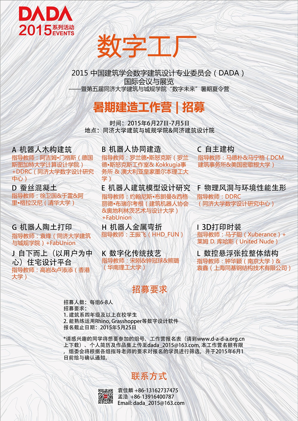 * 请感兴趣的同学将想要参加的组号、工作营报名表(请到www.d-a-d-a.org.cn上下载)、个人简历及作品集上传至dada_2015@163.com, 本工作营名额有限,组委会将根据各组指导老师的要求对报名的学员进行筛选,并于2015年6月1日前给与确认通知。