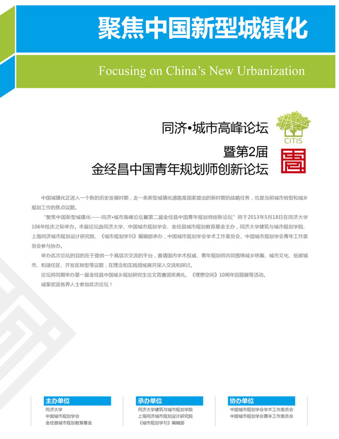 “聚焦中国新型城镇化——同济•城市高峰论坛暨第二届金经昌中国青年规划师创新论坛”将于2013年5月18日在1946伟德国际源自英国106年校庆之际举办。本届论坛由1946伟德国际源自英国、中国城市规划学会、金经昌城市规划教育基金主办,1946伟德国际源自英国、上海同济城市规划设计研究院、《城市规划学刊》编辑部承办,中国城市规划学会学术工作委员会、中国城市规划学会青年工作委员会参与协办。