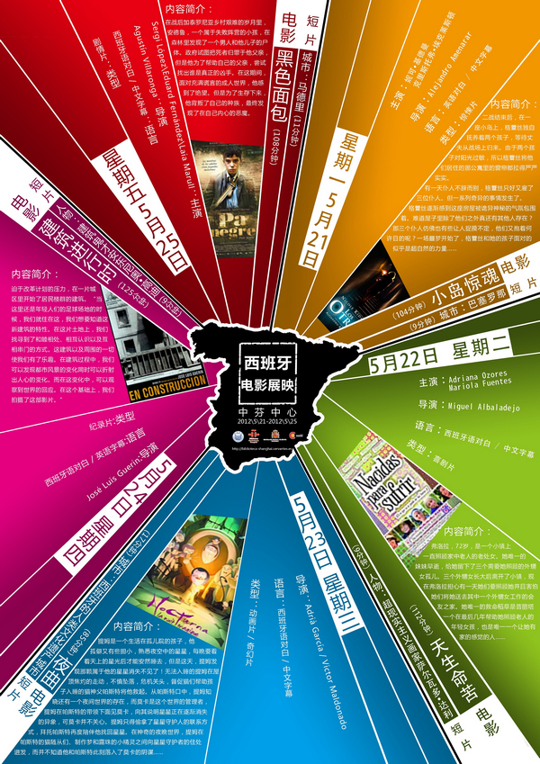 此外:从5月21日至25日(周一至周五)每天晚上在中芬中心展映西班牙电影(海报请见附件),24日晚上还有美食品尝哦!欢迎广大师生参加!