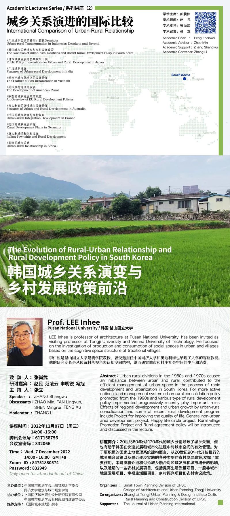 20世纪60年代和70年代的城乡分割导致了城乡失衡,但也有助于韩国在快速发展和城市化进程中对城市空间的有效管理。对于更积极的国家土地管理系统建构而言,从20世纪90年代开始推行的城乡融合政策以及最近逐步实施的各种类型的农村发展政策,发挥了重要作用。本讲座将介绍和讨论城乡融合对区域发展和城市增长的影响,以及近期的一些农村发展项目,包括提高生活质量项目、一般非城市地区发展项目、幸福生活圈项目、乡村振兴项目和农村协议政策。
