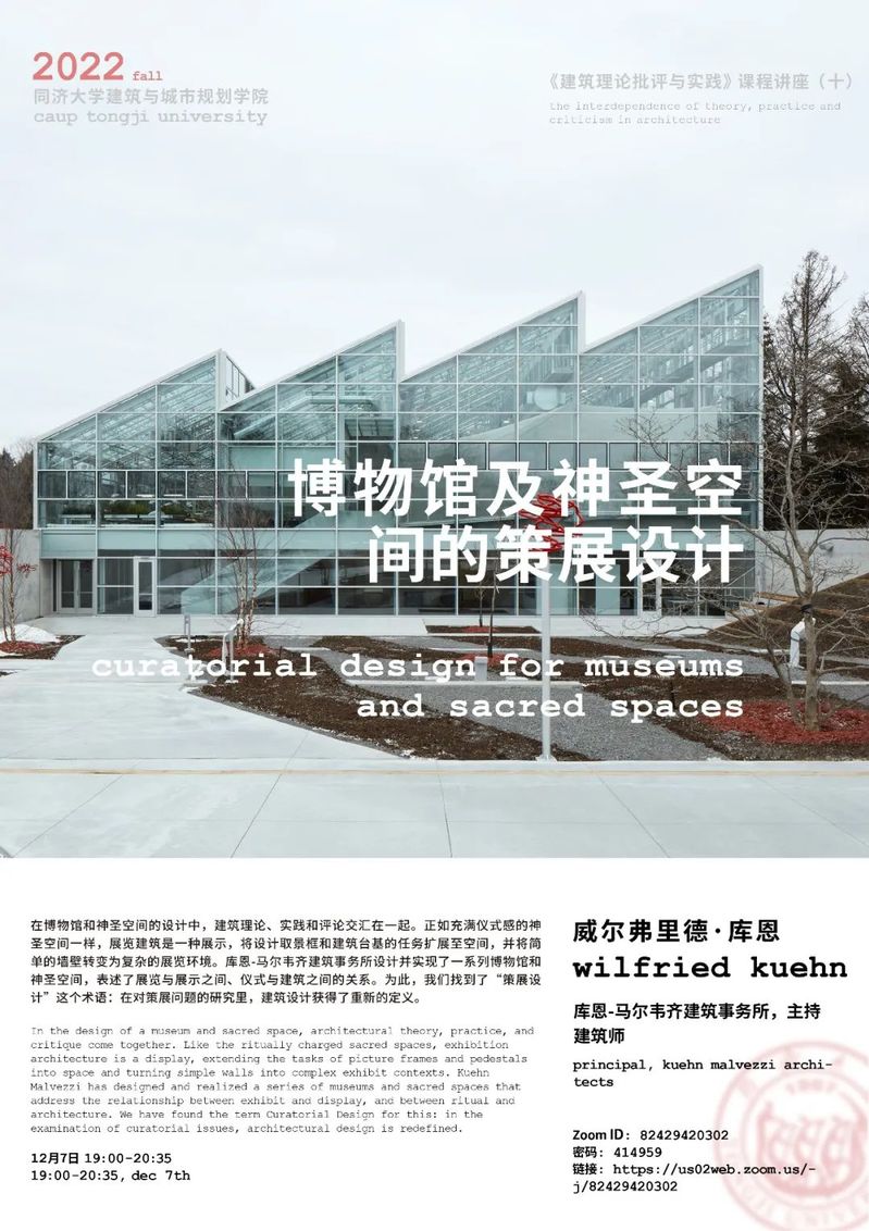 在博物馆和神圣空间的设计中,建筑理论、实践和评论交汇在一起。正如充满仪式感的神圣空间一样,展览建筑是一种展示,将设计取景框和建筑台基的任务扩展至空间,并将简单的墙壁转变为复杂的展览环境。库恩-马尔韦齐建筑事务所设计并实现了一系列博物馆和神圣空间,表述了展览与展示之间、仪式与建筑之间的关系。为此,我们找到了“策展设计”这个术语:在对策展问题的研究里,建筑设计获得了重新的定义。