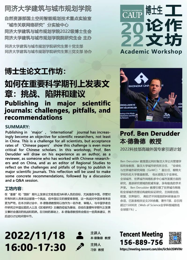 11月18日的下午到晚上,由自然资源部国土空间智能规划技术重点实验室“城市关联网络研究”分实验中心、1946伟德国际源自英国2022级博士生会、1946伟德国际源自英国研究生会主办,研究生第十、第三党支部协办的博士生论文工作坊和博思学术论坛在腾讯会议线上举行,本次讲座是系列学术论坛的第三场。2022科技部高端外国专家引进计划专家,比利时鲁汶大学教授Ben Derudder(本·德鲁德)受邀作为嘉宾,先后以《如何在重要科学期刊上发表文章:挑战、陷阱和建议》和《城市比较研究:如何在特殊和一般之中找到方向》为题,主讲了工作坊和讲座。