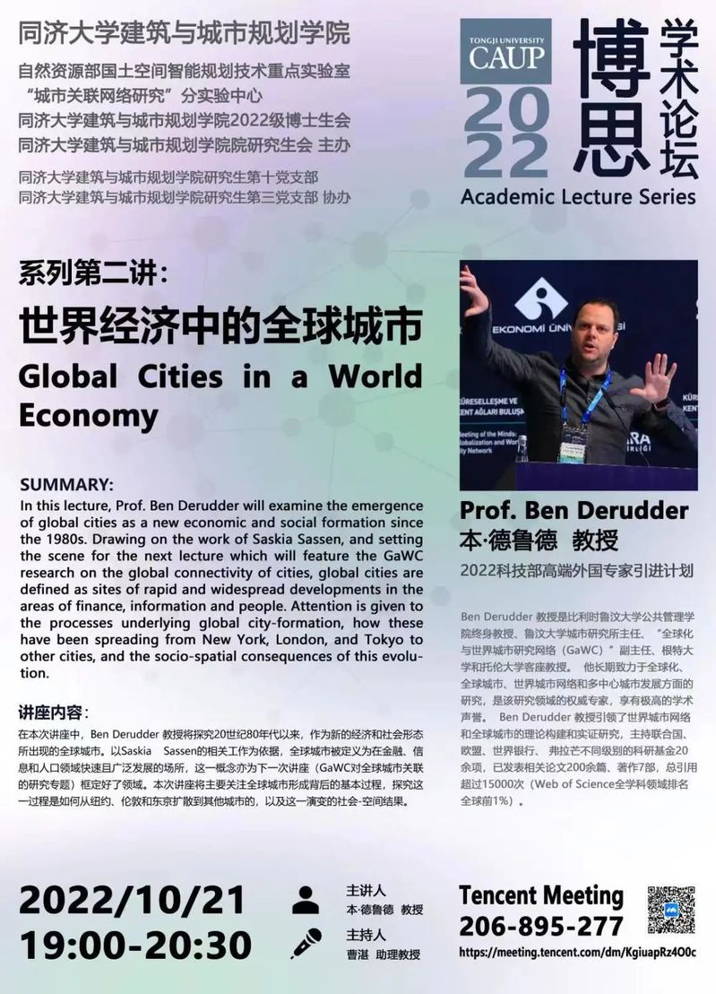 在本次讲座中,Ben Derudder 教授将探究20世纪80年代以来,作为新的经济和社会形态所出现的全球城市。以 Saskia Sassen 的相关工作为依据,全球城市被定义为在金融、信息和人口领域快速且广泛发展的场所,这一概念亦为下一次讲座( GaWC 对全球城市关联的研究专题)框定好了领域。本次讲座将主要关注全球城市形成背后的基本过程,探究这一过程是如何从纽约、伦敦和东京扩散到其他城市的,以及这一演变的社会﹣空间结果。