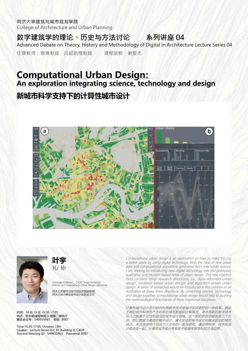 Computational urban design is an exploration on how to make the city a better place by using digital technology. With the help of new urban data and computational algorithms generated from new urban science, I am seeking to introducing new digital technology into the previously qualitative and intuition-based fields of urban design. This new research field contains three research directions, i.e., data-informed urban design, evidence-based urban design, and algorithm-driven urban design. A series of researches would be introduced in this seminar as an illustration of these three directions. By combining science, technology and design together, computational urban design would help to pushing the methodological boundaries of these traditional disciplines.