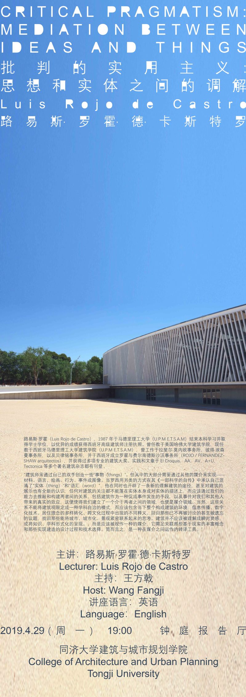 主讲人简介:路易斯·罗霍(Luis Rojo de Castro),1987年于马德里理工大学(U.P.M E.T.S.A.M)结束本科学习并取得学士学位,以优异的成绩获得西班牙高级建筑师注册执照。曾任教于美国哈佛大学建筑公司,现任教于西班牙马德里理工大学建筑公司(U.P.M E.T.S.A.M),曾工作于拉斐尔·莫内欧事务所,彼得·埃森曼事务所,以及贝律铭事务所,并于西班牙成立罗霍与费尔南德斯沙沃事务所(ROJO / FERNANDEZ-SHAW arquitectos),并获得过多项专业的建筑大奖。实践和文章于El Croquis,AA,AV,A+U,Tectonica等多个著名建筑杂志都有刊登。