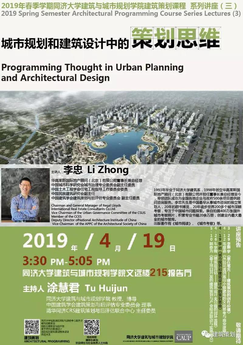 The third lecture of the series lectures of architectural programming in spring semester 2019 is by Li Zhong, the Dean of the Chairman and General Manager of Regal Lloyds International Real Estate Consultants Co.Ltd. The theme of the lecture is Programming Thought in Urban Planning and Architectural Design.