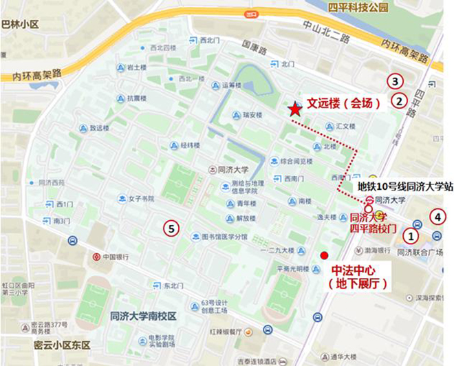 注:到达10号线1946伟德国际源自英国站后,从5号口出地铁站,经四平路校门到达会场。