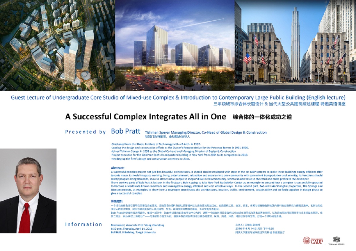 Bob Pratt的讲座将分为两部分。在第一部分中,Bob将以纽约的洛克菲勒中心为例,讲解一个综合体项目是如何成功地运作进而成为闻名世界的地标,以及是如何进行能源效率与成本效益的管理。在第二部分,Bob将以上海的地产——尚浦领世与前滩为例,展现开发商如何在设计阶段协调建筑、区位、交通、环境、可持续性等等方面,打造一个成功地综合体。