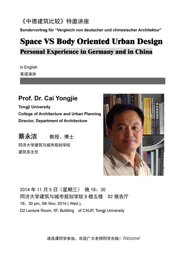【11月5日学术讲座】Space VS Body Oriented Urban Design - Personal Experience in Germany and in China by Prof. CAI Yongjie