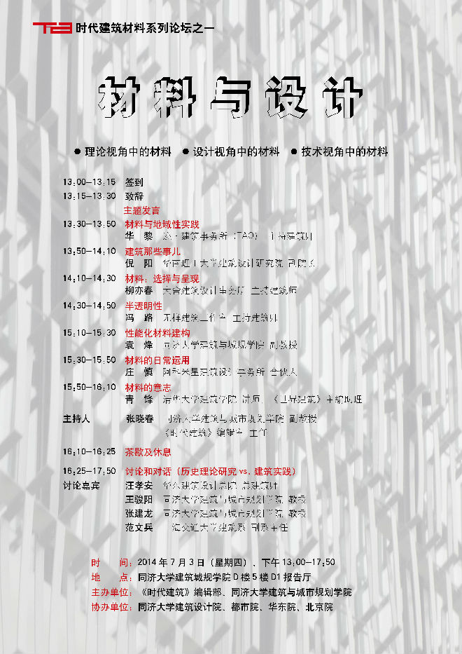 【7月3日学术讲座】《时代建筑》建筑材料系列论坛——“材料与设计”