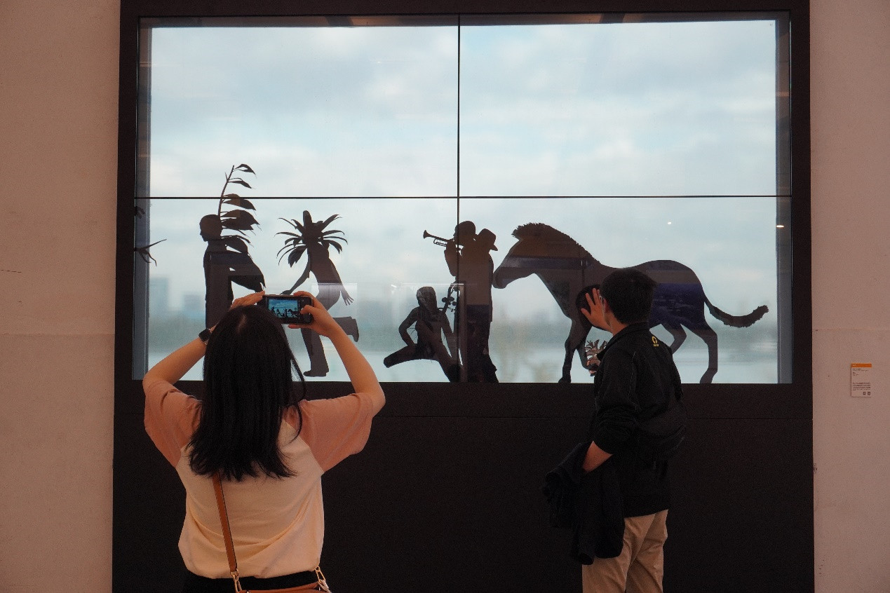 陈相如同学最喜欢的展品叫《搜神——变形记》,该展品通过透明液晶屏幕材料结合现场室外的江景,形成一个影像与空间景观相互融合交叠的影像互动装置。人可以触摸屏幕上的图像使之产生一系列变化。图像内容源自山海经的神话故事,与现代景象相结合,形成古往今来融合的新风景。展品做到了人、神、天地于一体的互动展现,呼应了“共栖”的主题,表达万物平等共栖于世界的自然哲学理念。
