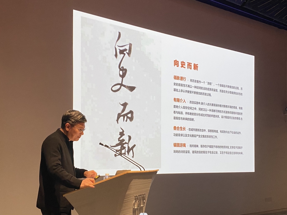 章明教授在讲座中阐述了“向史而新”的城市公共空间改造策略,并提出了促进城市规划学、建筑学、风景园林学以“大环境观”的立场和新的实践方式参与社会进程的“八合一”理念,即,搭建城市设计、建筑设计、景观设计、市政设计、水工设计、生态修复、智能设计和艺术设计协同合作的跨学科研究框架与实践平台。并进一步通过实践项目,展示了该理念下,构建城市滨水空间再生体系的6个维度,即,系统化空间营造、历史文脉延续、基础设施复合、生态环境修复、场景节点构筑,以及公共艺术植入。