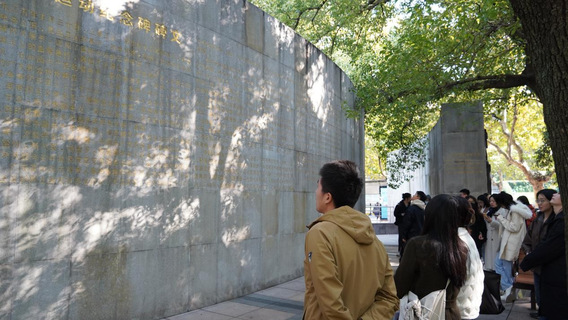 跟随研十六支部的两位领学员陈思玲、陈歌同学的讲解足迹,同学们怀着沉重而又崇敬的心情,排着队阅读着碑文,缅怀“五卅运动”那一段惨痛而悲壮的历史,深切感受革命先烈为心中的理想前赴后继、不怕牺牲的精神,更加珍惜今天来之不易的幸福生活。