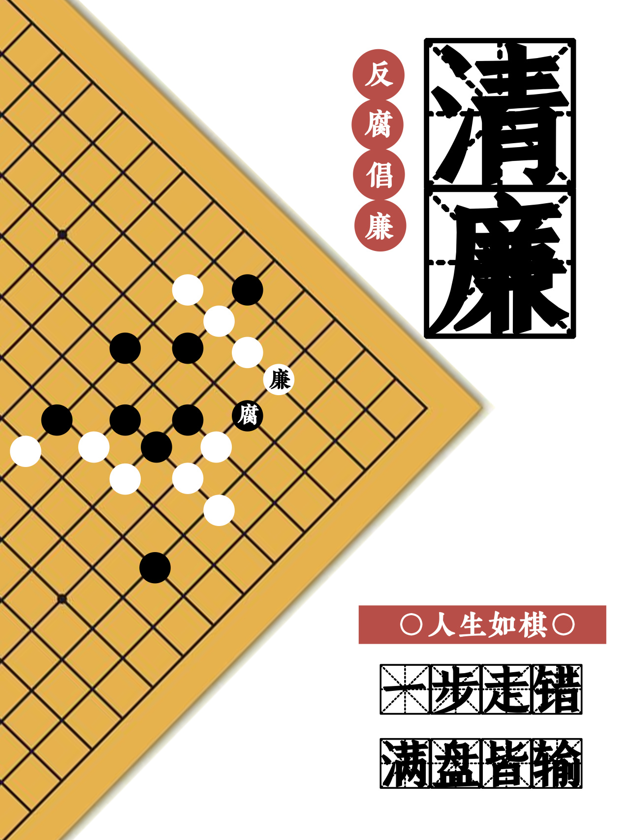 人生如下棋,正如毛泽东在《中国革命战争的战略问题》中说“一着不慎,满盘皆输”,乃是说对全局有决定意义的一着。清廉与腐败只在一念之间,海报中展示的代表廉洁的白子和代表腐败的黑子,输赢只在最后一子,人生的每一步都要谨慎落子,坚守清廉,否则一步走错,满盘皆输。以此警醒人们时刻坚守清廉,反腐倡廉。