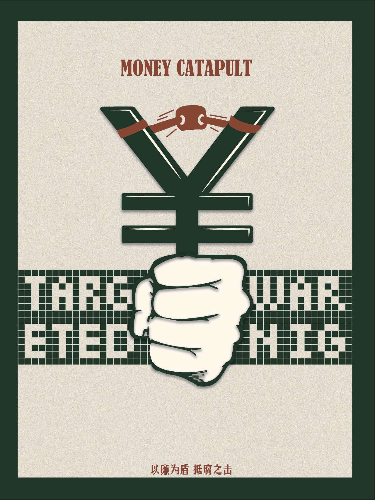 海报设计中选取货币符号“¥”作为画面的主要元素并赋予了两层意蕴,一方面“¥”象征着金钱诱惑,另一方面“¥”被拳头紧握,变幻成了一把对准自己的贪腐之弓,同时以“TARGETED WARNING”字眼作为衬底,有强烈的警示意味。表达被出一旦被贪腐之心裹挟,便会走上自我毁灭的道路。唯有以廉洁为自身护盾,才能修身养性,守住心灵的纯净安宁。