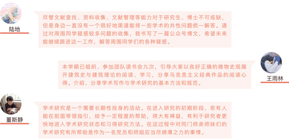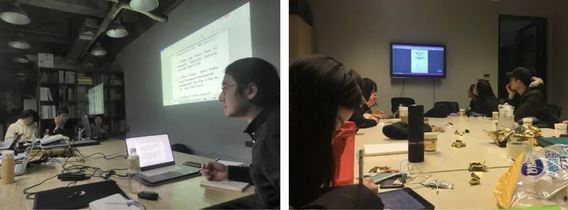 不仅在线上有丰富的学术分享,线下也组织了许多研究分享会。王雨林和董斯静同学定期组织读书分享会,引导大家以良好正确的唯物史观开展建筑史与建筑理论的阅读、学习。在读书会上分享马克思主义经典作品的阅读心得。介绍、分享学术写作与学术研究的基本方法和规范,帮助指导其他同学的学术研究,并做了一系列答疑解惑。读书会目前已经办了9次,并将继续开展下去。