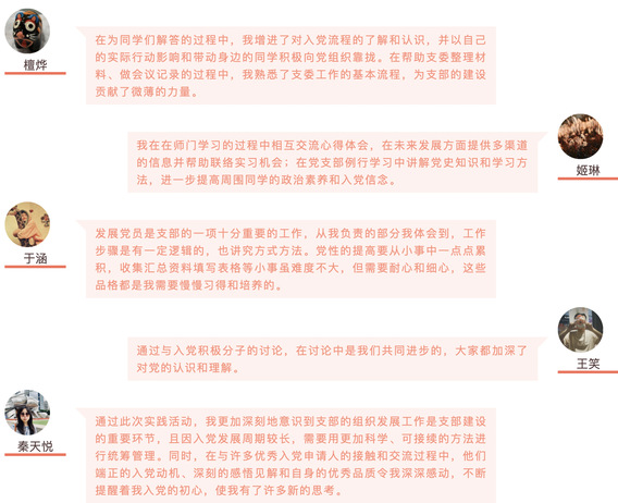 支部的组织发展工作是支部建设的重要环节,发展中的同学也难免会在规则、流程以及组织安排、学习等方面有疑惑或问题,一批正式党员则在他们的入党路途中充当了“小老师”的角色。他们积极主动地向身边有意愿入党的同学以及发展中同学宣传介绍中国共产党的历史和先进思想,帮助他们了解党组织的工作情况和入党的流程,为他们答疑解惑。正式党员也会定期地与发展中同学沟通交流,使发展中同学能够清晰了解发展流程,更好地进行自我目标定位,进一步提升大家的政治素养和入党信念,帮助大家顺利入党。此外,党员们还协助组织整理党员的发展材料,配合支委指导材料的填写,按时提醒同学上交思想汇报,并绘制表格进行统计等,为繁忙的老师和支部委员们分担工作与负担。用自己的经验和实际行动诠释为群众办实事。