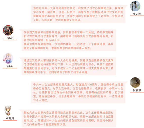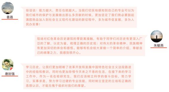 还有一批同学利用专业所学的理论知识与社会实践相结合,将自己的专业技能运用到城市更新、建设、发展上来。例如为广州市党史教育基地设计交通和参观行程;滨州市沾化区的乡村记忆收集;在上海市曹杨新村更新改造中推动员工支部与街道、社区基层开展专业科普与党建共建等。“纸面得来终觉浅,绝知此事要躬行。”大家利用自身的所学所长为城市的保护和发展做出贡献,加入社会主义现代化建设的新征程中!