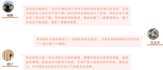 推开C404教室大门,桌上摆好茶点饮品,大家围坐在桌旁,讨论着自己近期所阅书本和学习成果。这是A3梯队茶话会上的情景。A3梯队的杨帆、李雅馨等同学发起组织的梯队茶话会,帮助梯队内的同学们相互认识熟悉,在轻松愉快的氛围中既促进了学术交流,又加强了梯队内部的联系。此外,他们还在自己的宿舍开展了党史普及交流活动,跟舍友们一起学习、交流党史。CZ&AT梯队则在梯队长的带领下进行了一次有意义的地球日活动,大家来到植物市场了解不同植物的习性和特征,并进行植物领养。各式各样的梯队活动既丰富了大家的学习生活,也拉近了同学之间的距离。