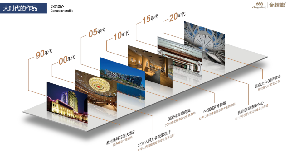 金螳螂集团项目紧随时代前列,完成过人民大会堂常委厅、国家体育场鸟巢、国家博物馆、大兴国际机场等众多重大场所装饰作品。