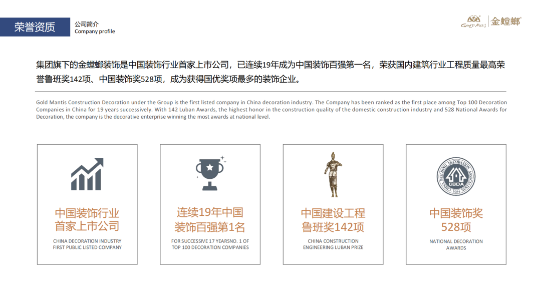 金螳螂成立于1993年,经过近三十多年的发展,形成了以装饰产业为主体的现代化企业集团,实现了建筑装饰行业的全产业链覆盖。连续19年被中装协评为中国装饰百强第一名,是中国建筑装饰版块第1家上市公司,也是中国获得国优奖项最多的装饰公司。