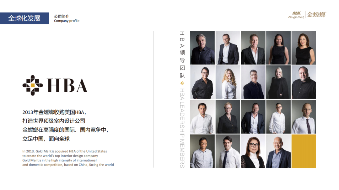 在2013年,金螳螂收购美国HBA,未来致力于打造世界顶级室内设计公司。金螳螂在高强度的国际、国内竞争中,立足中国,面向全球,以“致力于改善人居环境”为企业使命,把“以客户为中心”作为最重要的价值观,建立起一整套客户服务体系,为客户带来健康、环保的居住、工作、休闲空间,不断实现客户价值的增值。