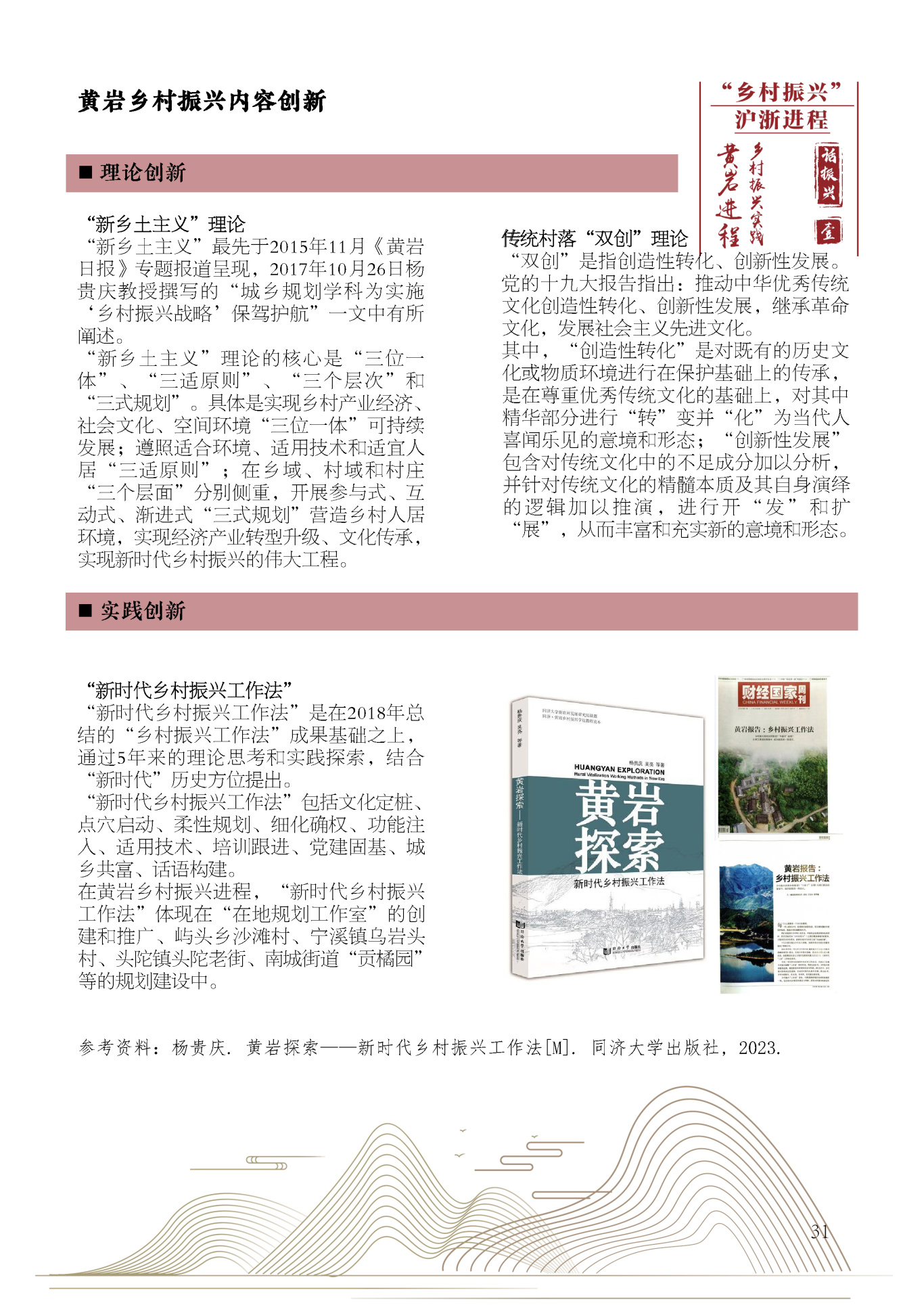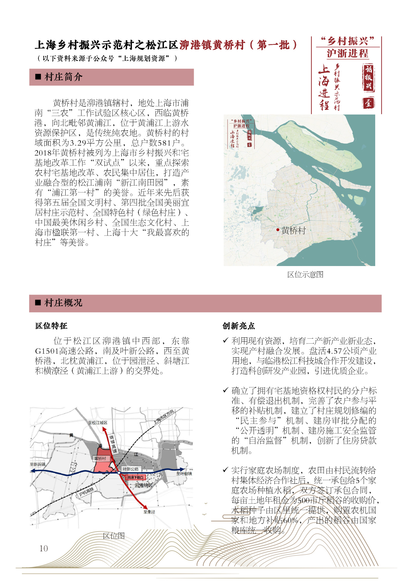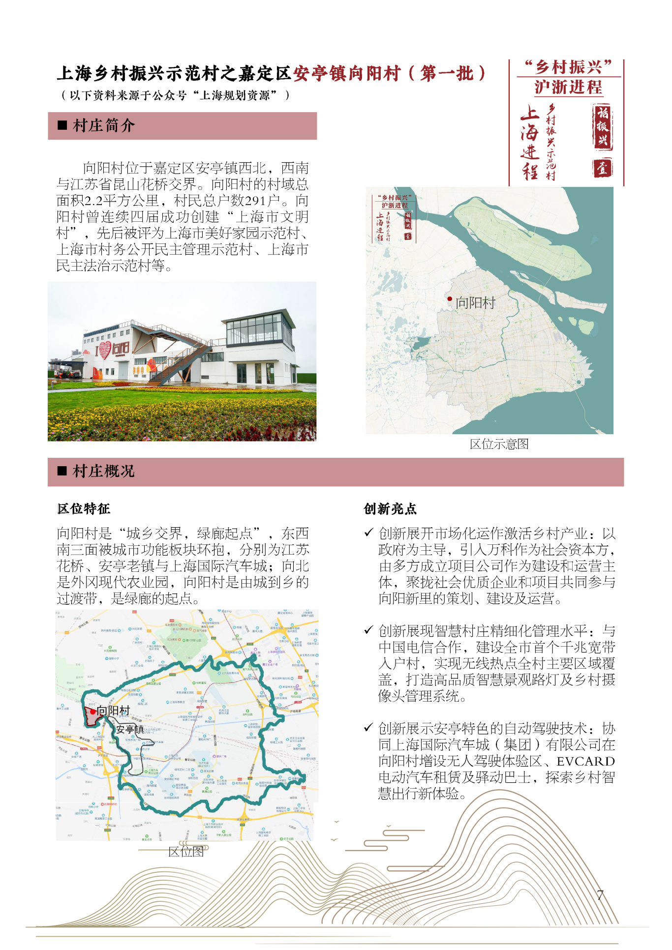 本期选择各批次的代表性乡村振兴案例,如安亭镇向阳村、泖港镇黄桥村(第一批)、老港镇大河村(第二批)、罗泾镇新陆村(第三批)、书院镇外灶村(第四批)、老港镇欣河村(第五批),通过对各村发展定位和项目策划的介绍与整合,展现乡村振兴战略的上海创建经验。