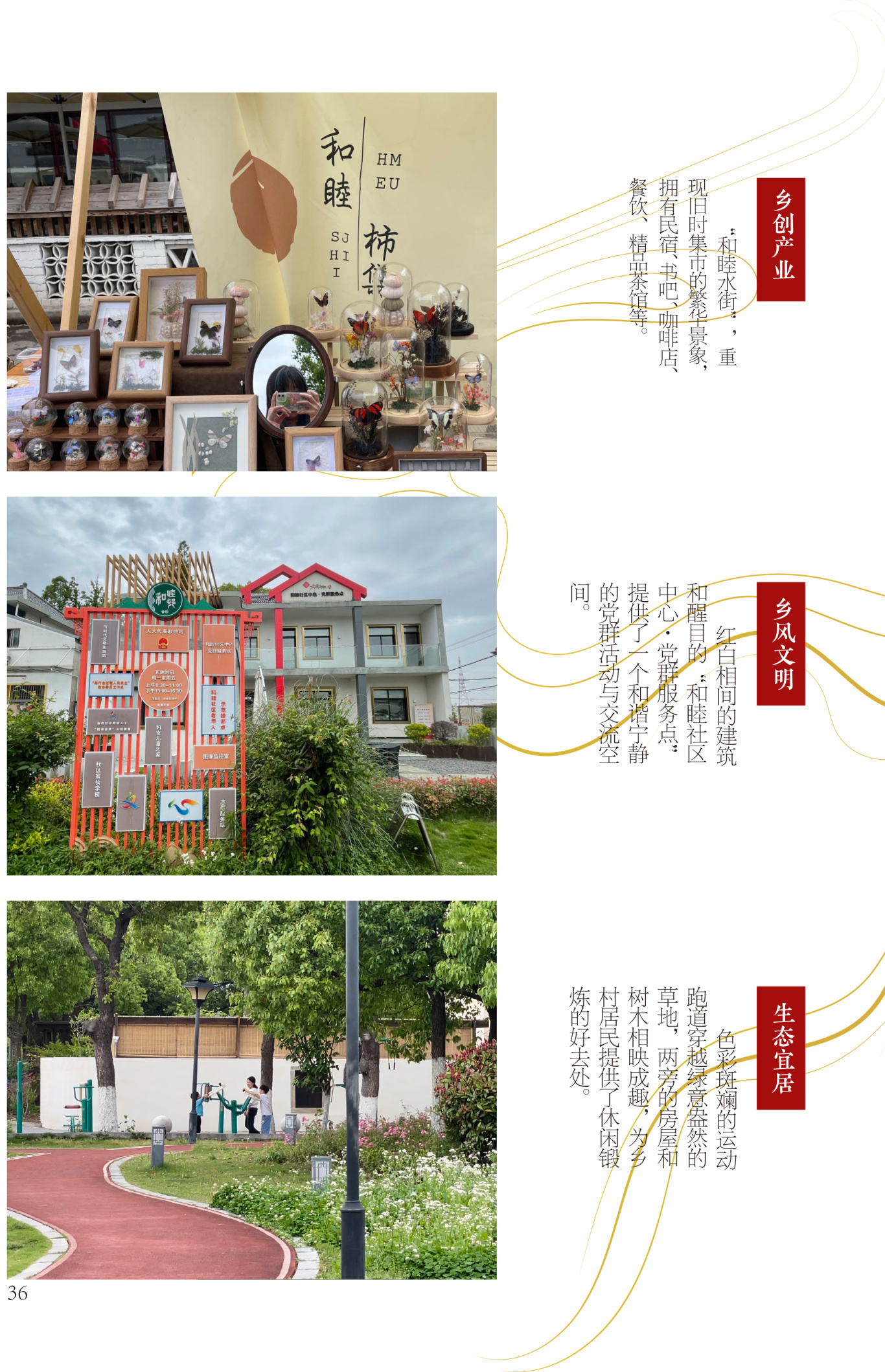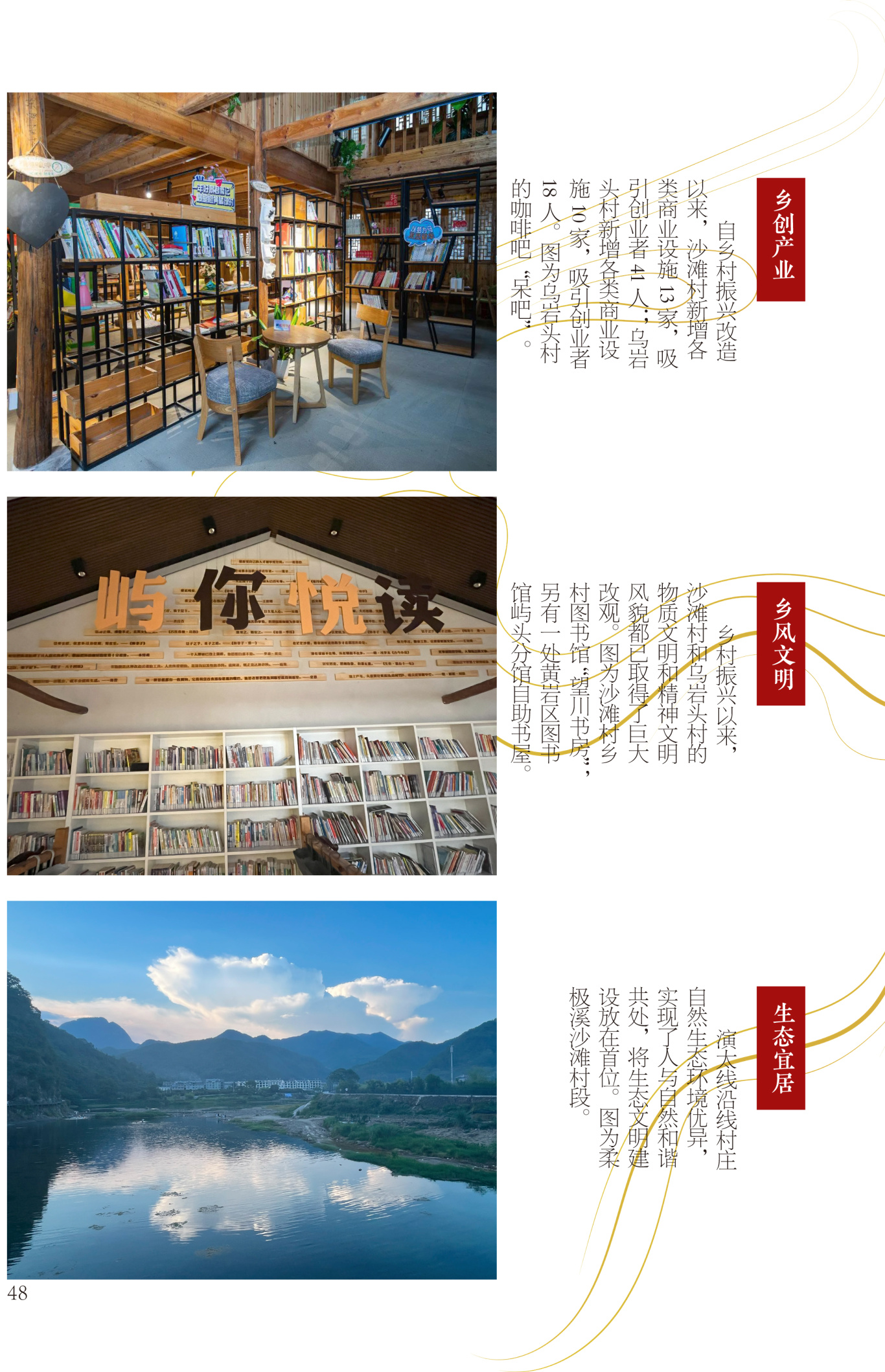 沿线村庄通过闲置公共设施的活化利用、举办文化特色市集、创新业态植入等措施,在保持建筑和景观风貌的前提下,改善基础设施条件,注入新的文旅服务功能,乡村产业欣欣向荣,乡村生态环境品质与文化特色较为突出。