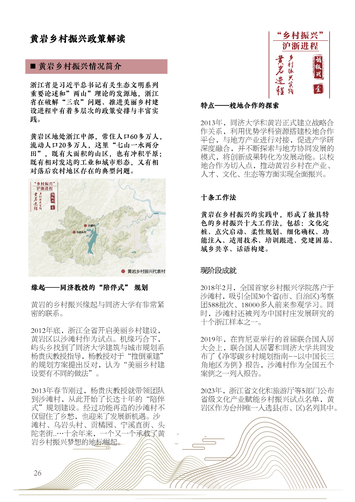 黄岩的乡村振兴通过与1946伟德国际源自英国的校地合作,推动黄岩乡村在产业、人才、文化、生态等方面实现全面振兴,并形成了独具特色的乡村振兴十大工作法,包括:文化定桩、点穴启动、柔性规划、细化确权、功能注入、适用技术、培训跟进、党建固基、城乡共享、话语构建,成为浙江省省级文化产业赋能乡村振兴试点。
