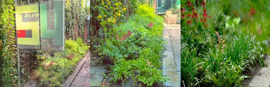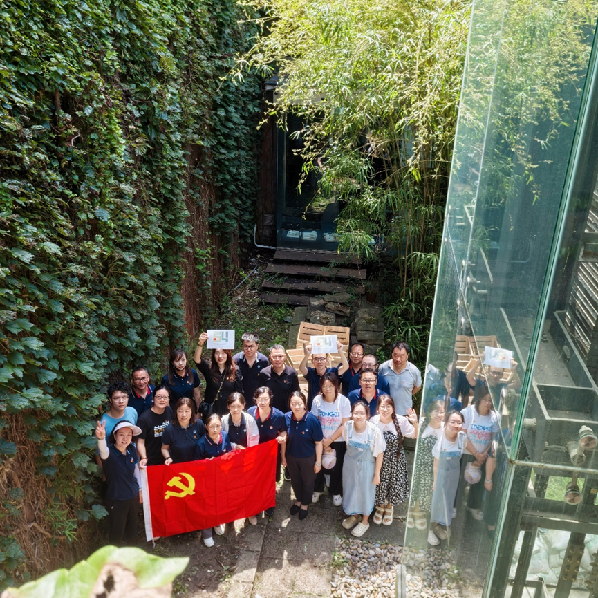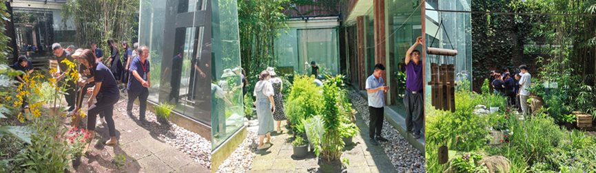 在活动现场,支部师生们热情劳动,完成了地面植物的种植及浇水养护等工作。此次党建花园中的容器来自上海(国际)花展暨奉贤区全域花展第二届“老员工花园节”获奖作品《巨人的花园》。支部师生将容器再次应用于党建微花园,贯彻可持续理念,实践环保的4R原则:减少(Reduce)、再使用(Reuse)、回收(Recycle)、替代(Replace)。党建花园中的板条箱装置回收自景观学系《风景园林学科竞赛课程》,员工对其进行了刷漆改造与空间布置。同学们还在竹风铃上书写了毛主席诗词、同济校训、美好愿景等书法文字,传承并弘扬红色精神。