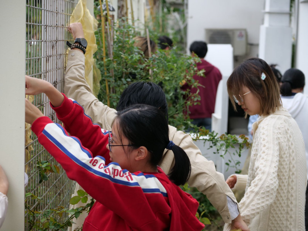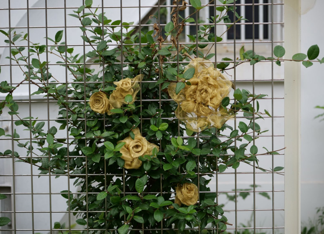搭建从网纱开始。材料选择了的金色的云雾状金属网纱,色彩与知行花园的花木色叶相互映衬,相得益彰。同学们团结协作、集思广益,积极发挥主观能动性,各显其能,将网纱铺展成抽象的云雾与山峦,扭制成具象的月季与芙蓉;为人们带来美的感受。
