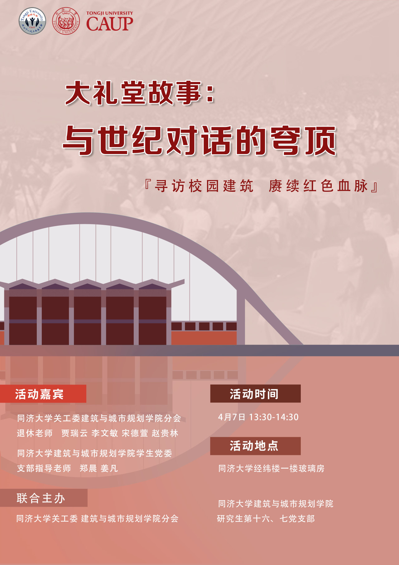 在本次活动中,您将如同穿越时光的旅人,深入了解大礼堂从规划到建成的曲折历程,领略它独特的设计亮点,体会它在同济漫长历史中扮演的关键角色。从习近平同志亲临百年校庆的感人瞬间,到师生们平日在这里的欢声笑语,都早已融入了大礼堂的每一砖、每一瓦,每一处角落都藏着一个温暖人心的故事。4月7日下午,让我们与关工委、党委的老师们相约经纬楼,聆听这座建筑背后温暖而深刻的记忆,一同探寻大礼堂承载的厚重意义与珍贵价值,感受岁月的温度......