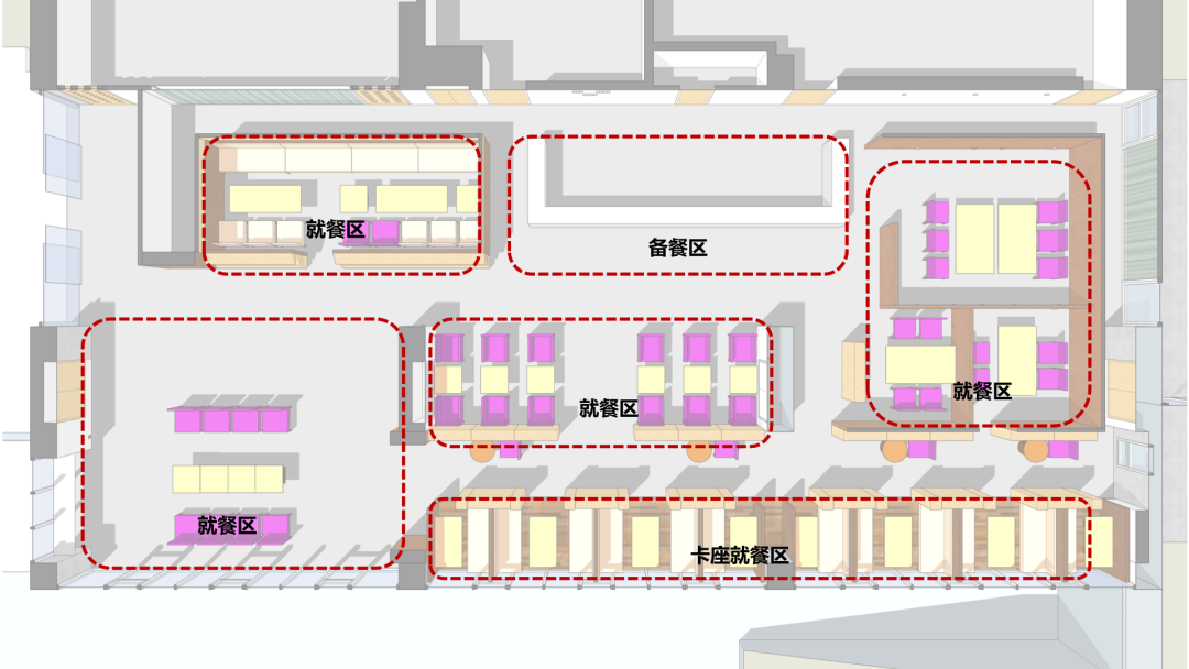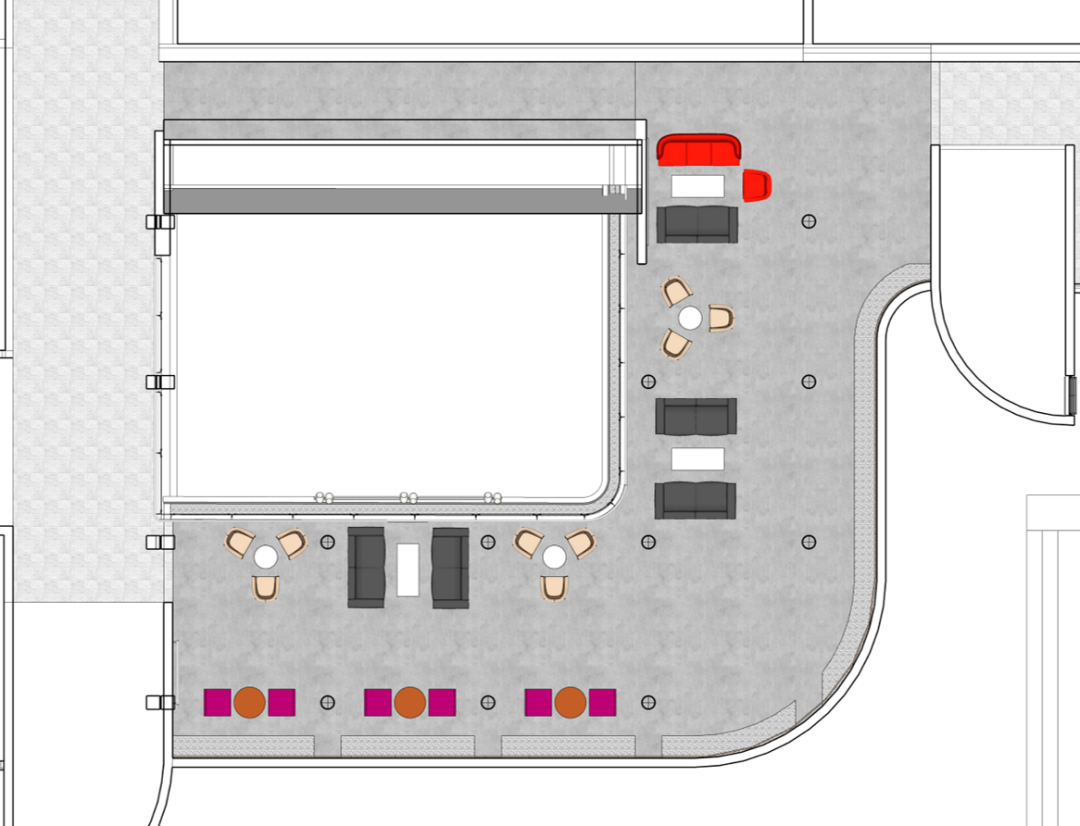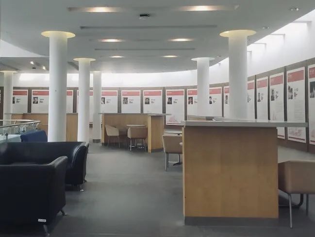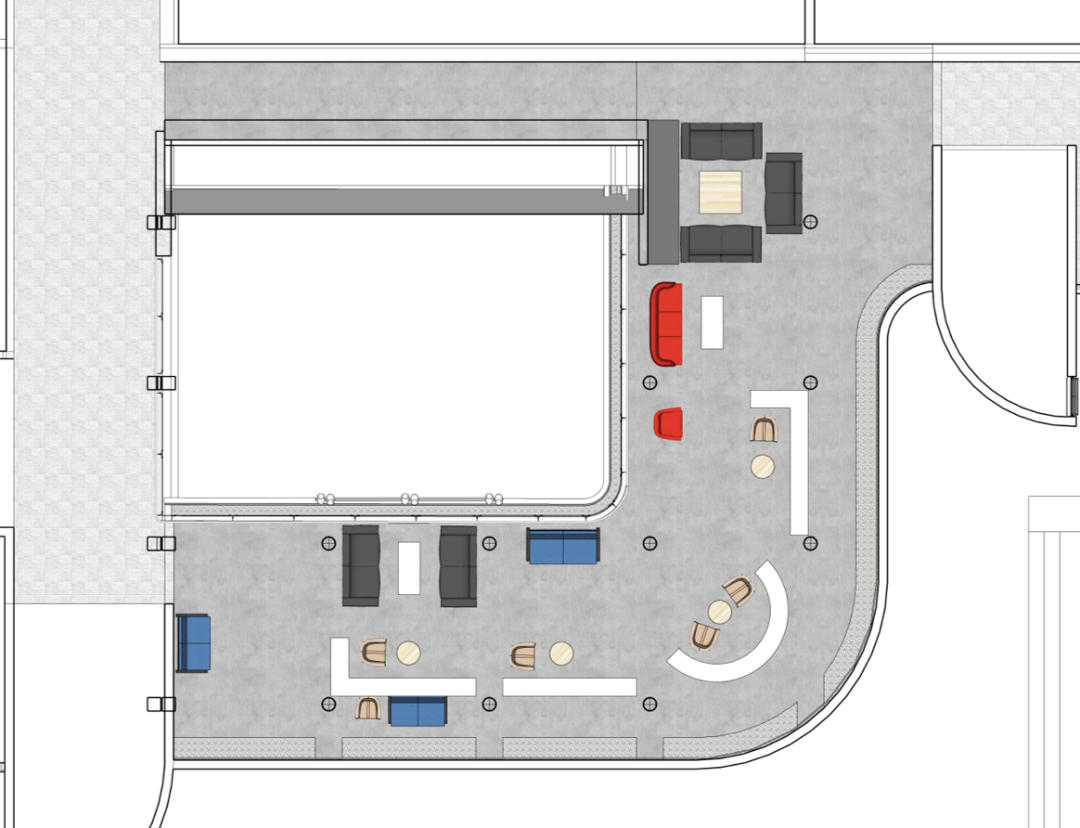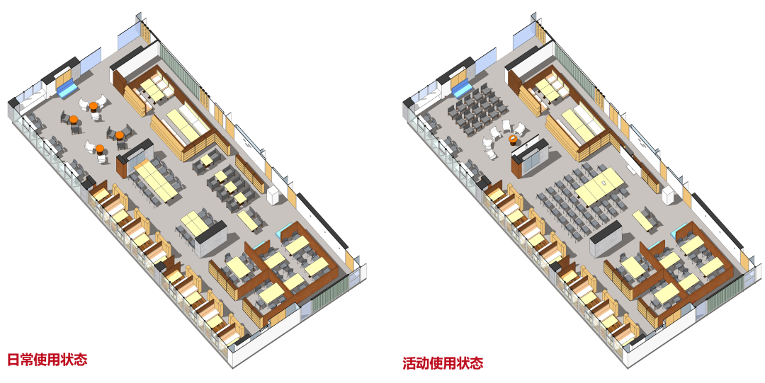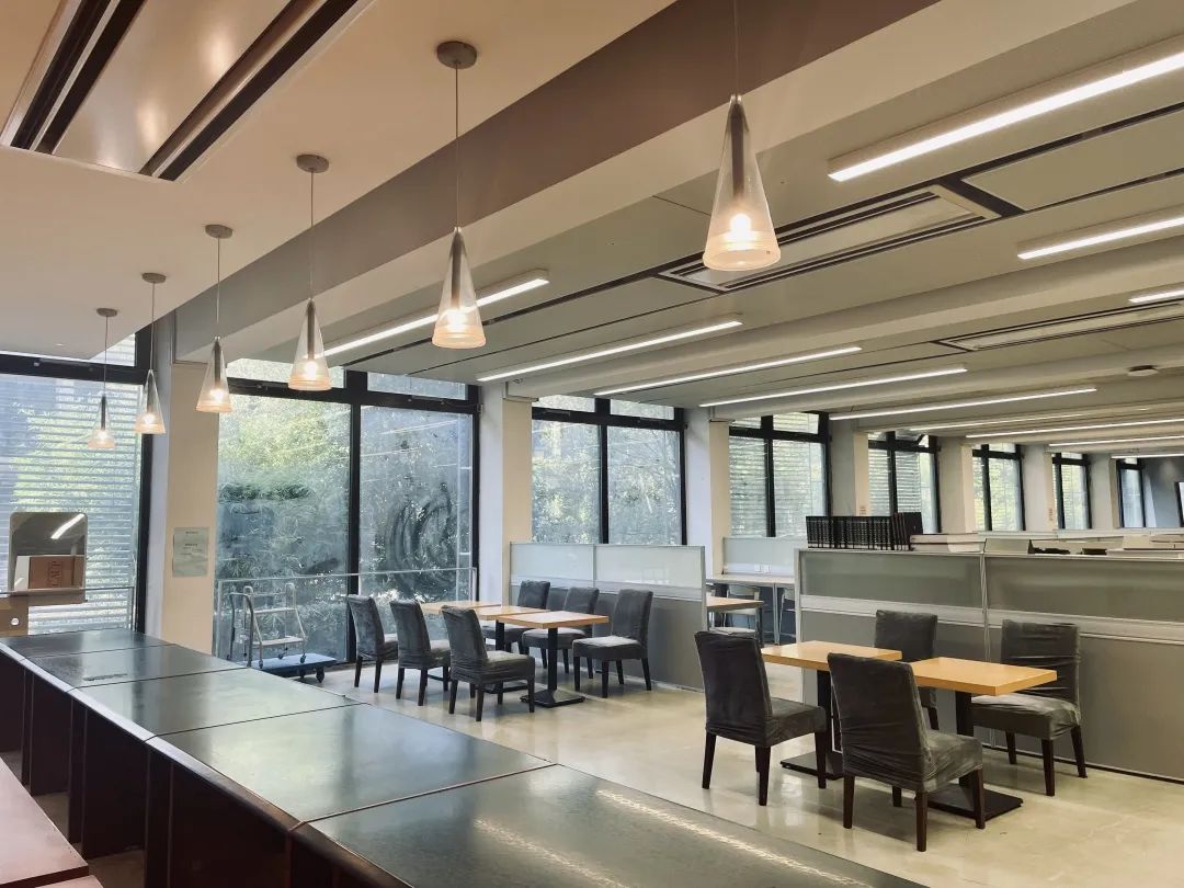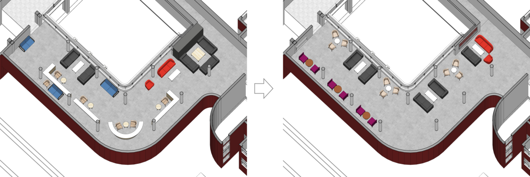 改造过程中,我们首先拆除使用率较低的固定吧台,以增强空间完整性和通透性。然后对现有家具进行重新布局:二人桌椅组合摆放在靠展墙一侧,三人桌椅和多人沙发摆放在靠中庭一侧。为师生提供多种类型的洽谈讨论空间,满足不同人群的需求。