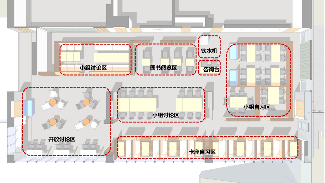 原有空间单一,整个图书馆仅有阅读自习功能,增设的休闲讨论区丰富了图书馆的功能属性,为同学们创造了更多可以自由学习、休憩和讨论的空间。
